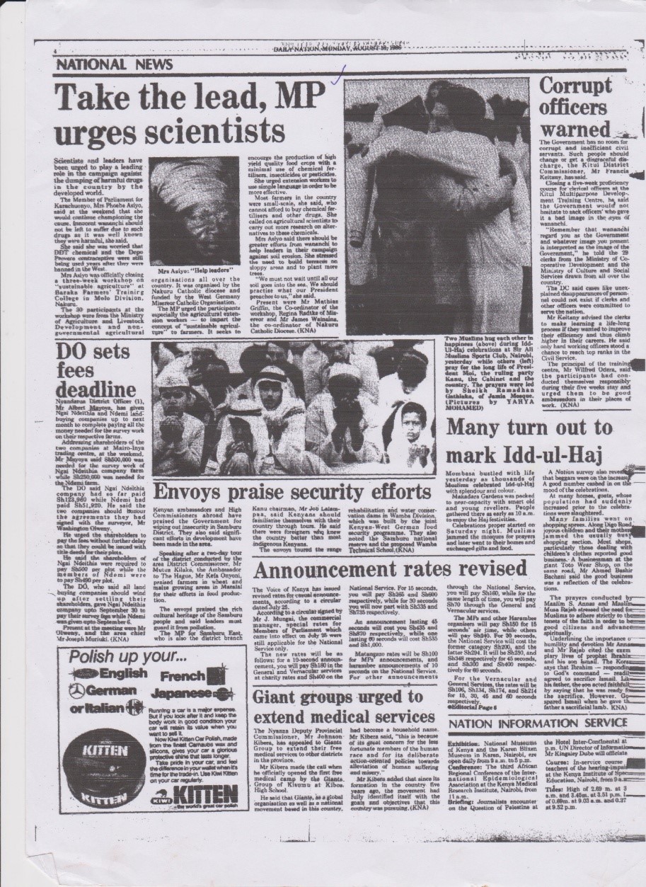 Mrs. asiyo urged leaders to campaign against the dumping of drugs in the country by developed countries. She also requested scientists to carry out research and determine whether drugs and chemicals brought in the country are safe to use.